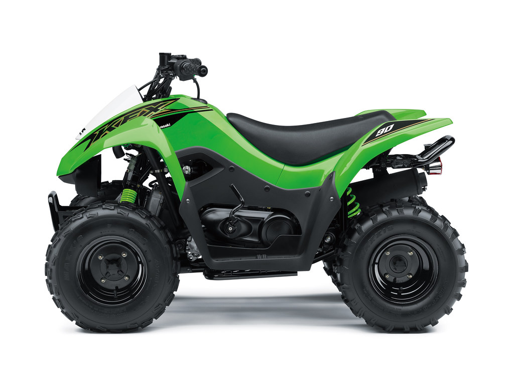 Just like the smaller KFX50, the KFX90 has aggressive styling and lines mimicking its larger KFX models. The KFX90 features an electric start, beginner friendly CVT transmissions, a full floorboard design which protects feet and legs, single A-arm front suspension, rear swingarm suspension design, chain final drive, fast 89cc engine and throttle limiting screw, allowing parents to limit throttle opening to help new riders gain experience at slower speeds. The KFX90 comes in a new Bright White.